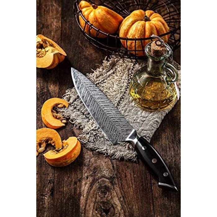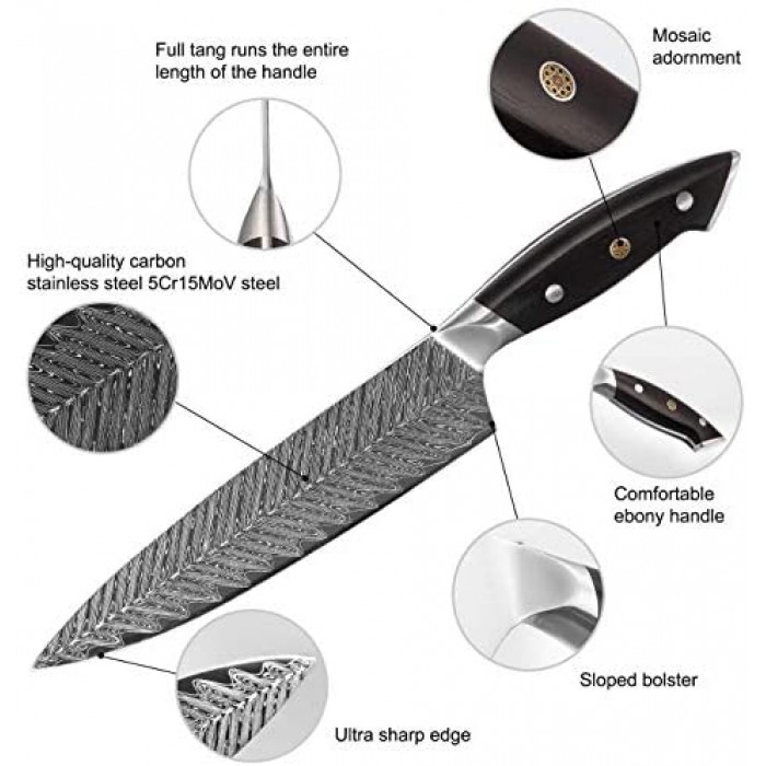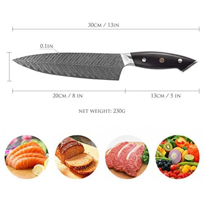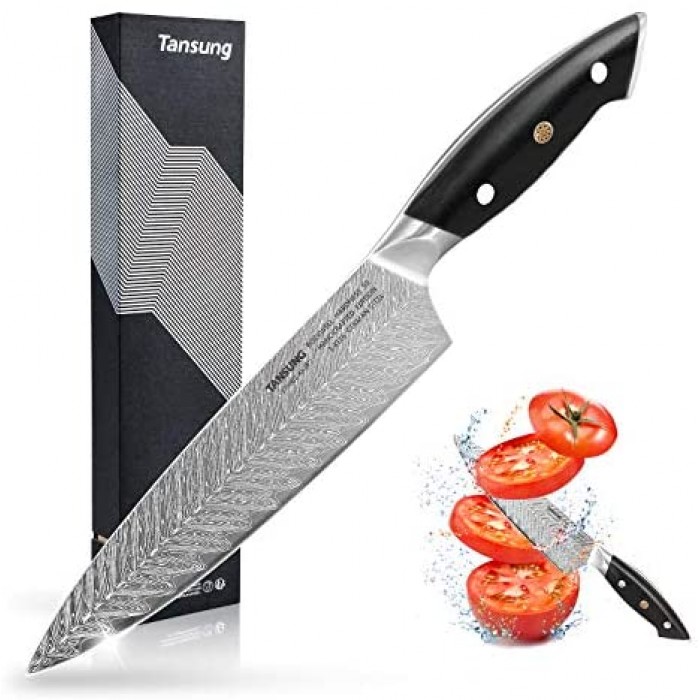 - ??8 Inch Pro Chef's Knife ?Tansung kitchen knife is of high quality, ultra sharp, well balanced and durable, hand-finished by experienced craftsmen, this professional chef knife is specially with streamlined neck design and glossy finish Damascus pattern on surface to prevent it from fading, tarnishing, rusting, corroding and sticking, ideal present for chefs and cooking fonders with elegant gift box