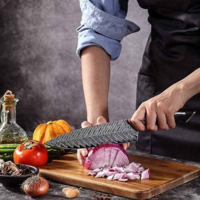 - ??Unrivaled Cutting Performance? This professional 8 inch chef knife designed as a multifunctional versatile knife providing extraordinary performance when chopping, slicing, mincing and dicing meat, fruits, vegetables, cheese, etc. Please be careful when using the sharp knife. For the knife maintenance, not recommend to use it for iced food or chopping meat with large bones
